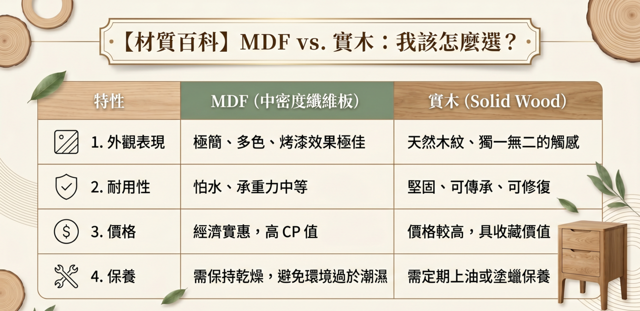 其它 【家居百科】MDF 是什麼?選購家具前必讀的材質全攻略 2026 年 4 月 21 日 Posted by 戴瑋蔆 21 4 月 在挑選質感家具時,你是否常看到「MDF」這個縮寫?許多人會問:這跟實木有什麼不同?耐用嗎? 一、 什麼是 MDF?(中密度纖維板) MDF 全名為 Medium Density Fiberboard,中文稱為「中密度纖維板」。它的製作原理是將木材纖維(通常是木材碎片或回收木)打碎成細粉,加入合成樹脂與壓力膠合,經過高溫高壓擠壓而成的「人造板材」。 二、 為什麼現代家具愛用 MDF?(三大優勢) 平整度極高,烤漆的首選: MDF 表面非常光滑,沒有實木的年輪、節點或毛細孔。這就是為什麼我們看到的北歐風純白餐桌、極簡亮面收納櫃,大多是使用 MDF 搭配高級噴漆,呈現出的色彩飽和度非常驚人。物理穩定度,不易開裂: 實木家具最怕「熱脹冷縮」。MDF 因為結構均勻,對於溫度與濕度的反應比實木穩定得多,較不容易發生扭曲或乾裂。環境友善與價格優勢: MDF 利用了剩餘木材資源,不僅降低了對森林的直接開發負擔,也讓消費者能以更親民的價格,擁有設計感十足的家具。 三、 MDF vs. 實木:我該怎麼選? 四、 梵美家居的挑選小貼士:如何延長 MDF 家具壽命? 雖然 MDF 優點眾多,但它有一個天敵:「長期潮濕」。 如果你購買了 MDF 材質的家具,記得以下三點保養祕訣:避免積水: 若不慎打翻水,請立即擦乾,避免水分滲入板材邊緣導致膨脹。放置地點: 建議放在通風良好的乾燥處,不宜放在浴室門口或長期潮濕的地下室。定期清潔: 使用微濕的軟布擦拭,再用乾布帶走殘餘水分即可。 五、 結語:美學,不必昂貴 在 梵美家居,我們認為好的生活品味不應該受限於預算。MDF 的存在,讓我們能將現代美學帶入更多人的家中。只要挑選高品質的貼皮技術與甲醛檢驗合格的產品,MDF 絕對是打造「理想家園」的聰明選擇。
